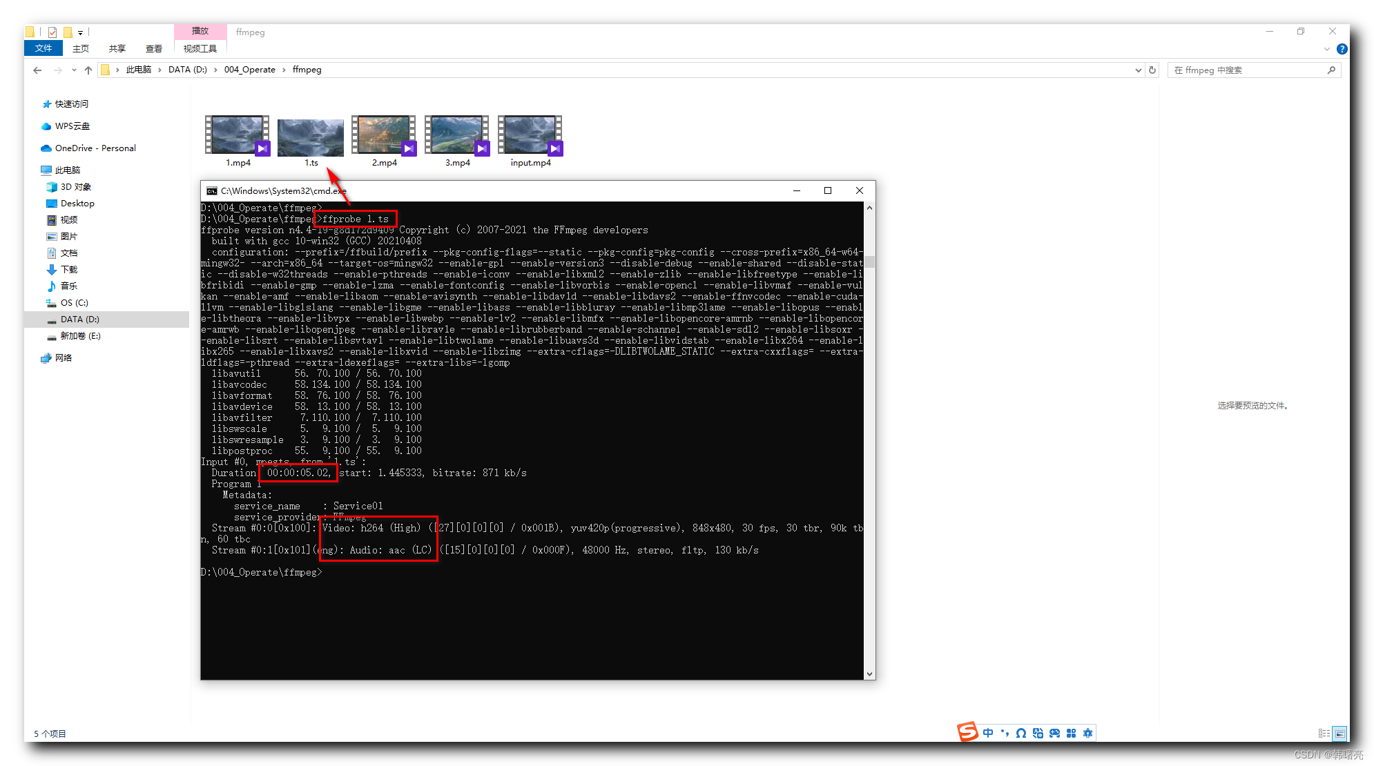 ffprobe 1.ts命令 , 查看 1.ts 视频容器 中的 视频信息如下 :