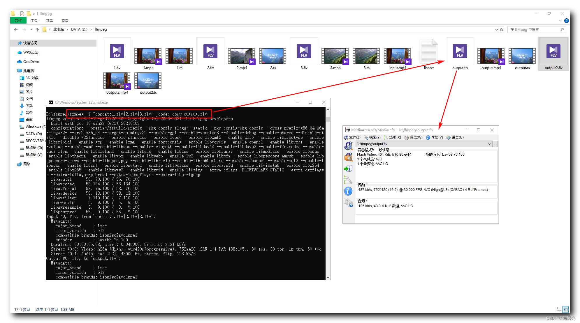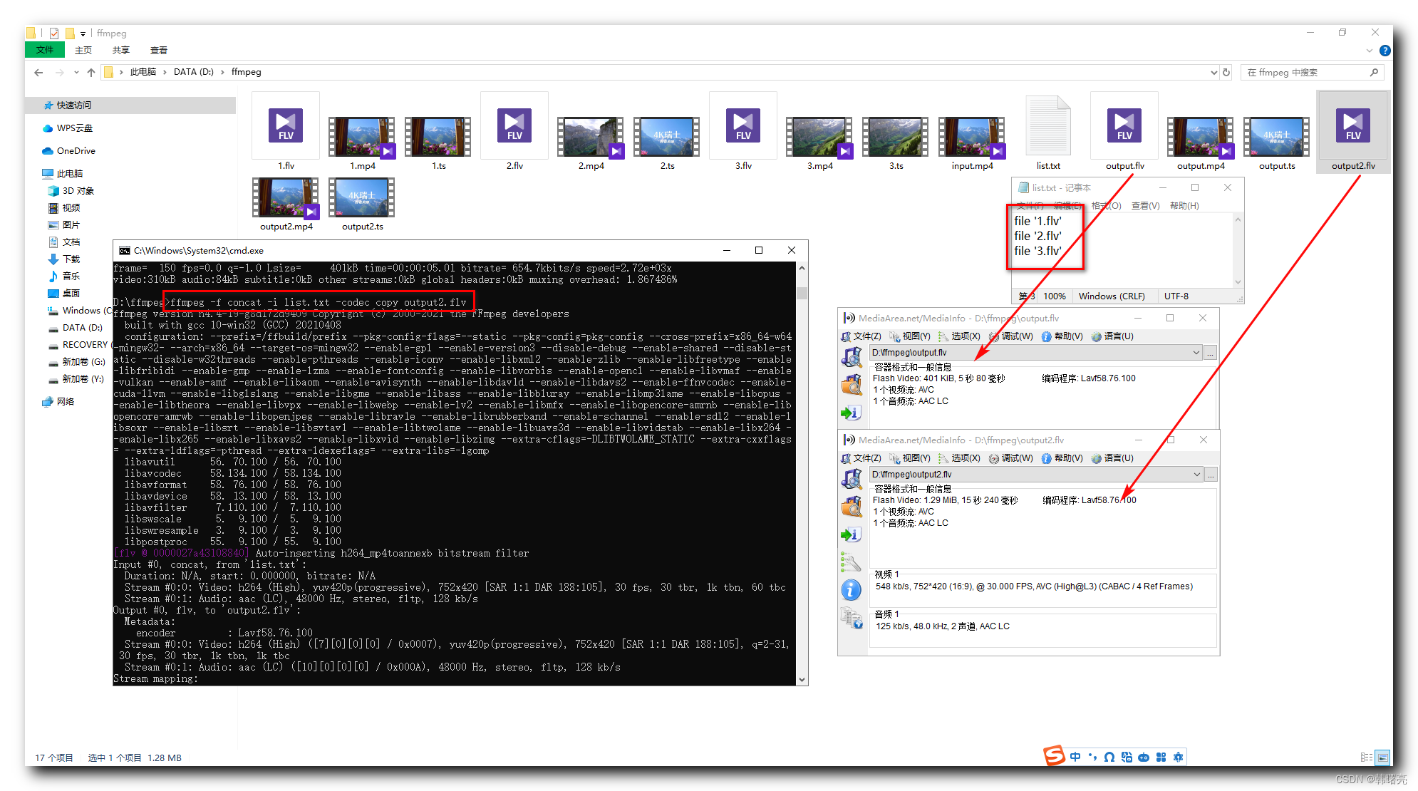 ffmpeg -f concat -i list.txt -codec copy output2.flv命令 , 成功拼接视频 并且可以成功播放 ;