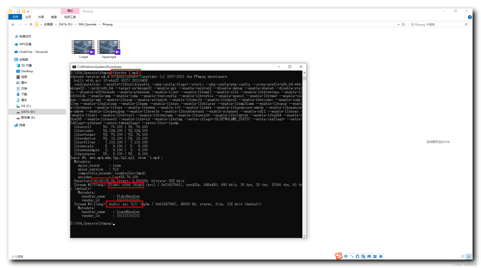 ffprobe 1.mp4查看裁剪出的视频信息 , 时长是 5 秒 , 视频编码是 H264 编码 , 音频编码是 AAC 编码 ;