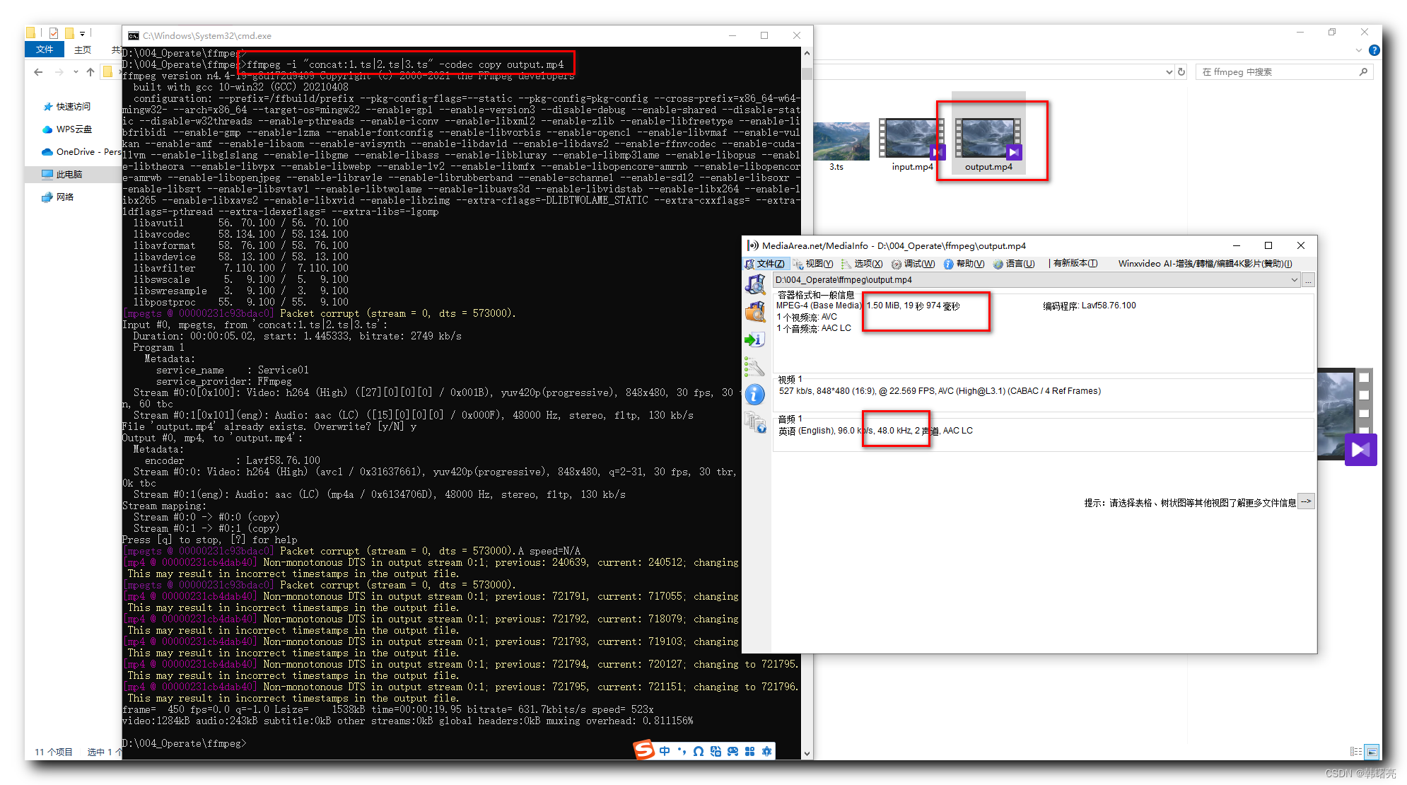 ffmpeg -i "concat:1.ts|2.ts|3.ts" -codec copy output.mp4命令 , 将 1.ts , 2.ts , 3.ts 这 3 个视频文件进行拼接 , 拼接过程也出现了 DTS 警告 , 视频时长是对的 , 但是 第二个音频 的采样率是错误的 , 播放 output.mp4 文件时 , 中间一段直接跳过 , 该输出文件有问题 ;