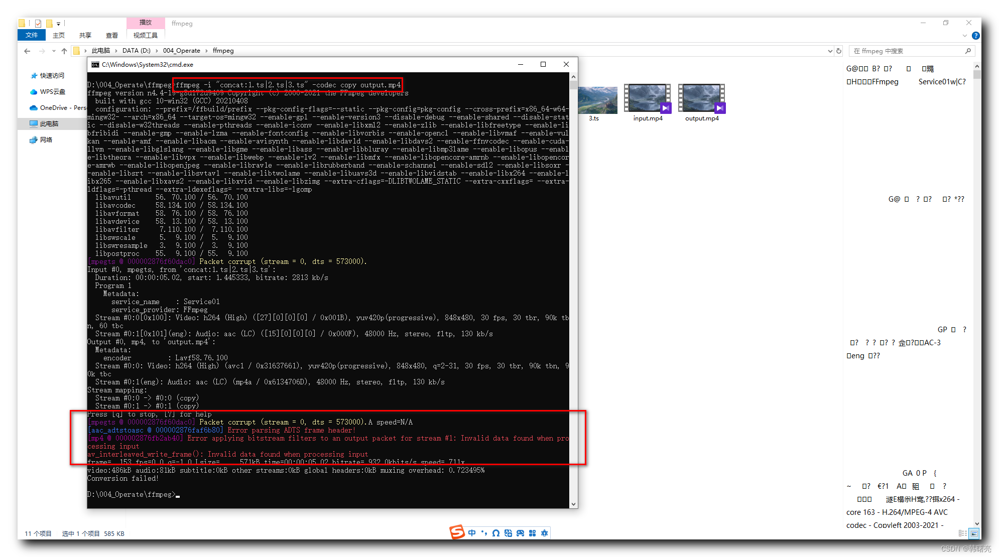 ffmpeg -i "concat:1.ts|2.ts|3.ts" -codec copy output.mp4命令 , 将 1.ts , 2.ts , 3.ts 这 3 个视频文件进行拼接 , 拼接过程就直接报错了 , 最终输出文件只有 5 秒 , 也就是 1.ts 的内容 , 剩余两个视频没有拼接上去 ;