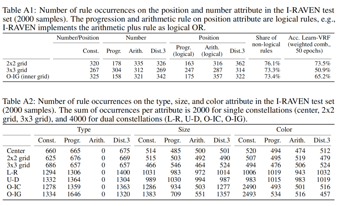 表A1和表A2分别显示了数量/位置和类型/尺寸/颜色属性的规则出现次数。在位置属性上,逻辑规则(级数和算术)在2x2网格.3x3网格和出入网格星座上分别占23.9%、26.7%和26.6%。由于Learn‑VRF无法表示这些逻辑规则,因此可以通过非逻辑规则的份额来确定准确性的上限(即76.1%、73.3%和73.4%)事实上,Learn‑VRF(加权组合,50个epoch)几乎达到了2x2网格的上限(73.5%vs.76.1%),而在3x3网格(50.9%vs.73.3%)和out‑in网格上的性能(65.2% vs.73.4%)稍稍落后。