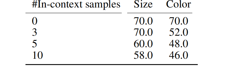 作为附加实验,我们测试了情境学习对算术规则的影响。我们随机选择的上下文示例,其中包含不同属性的算术规则从被测试的情况来看,例如,对于带有属性大小算术OOD测试,我们展示了对颜色(但不是尺寸)应用算术的其他示例。由于没有上下文示例可以在解缠结配置中显示,我们切换到纠缠设置。图A2显示一个例子。为了减少提示的量,我们只对 50 个样本的子集进行了测试,这仍然是给出趋势的指示。表 A3 中显示的结果表明情境学习在此应用中是相当有害的。进一步的努力,例如提示调整(例如,上下的选择和安排可以提高LLM实验的情境学习表现[34]。