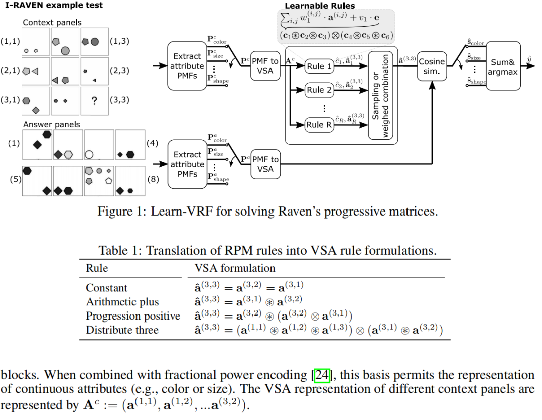 然而,概率性绑架推理涉及详尽的符号搜索。例如,它需要搜索描述可能统治RPM测试的所有可能规则实现的符号,以便能够推导规则的概率分布[18]。减少这种搜索复杂性的一个可行选择是利用由矢量符号体系结构(VSA)[22–25]提供的分布式表示,该表示建立在支持明确定义的操作的丰富代数基础上,包括乘法绑定、解绑、加法叠加、排列和相似性搜索,从而能够在高维分布式表示之上执行符号计算。因此,提出了神经矢量符号体系结构(NVSA)[20],该体系结构利用分布式VSA表示和运算符执行可行的概率性绑架推理,提供在叠加计算中进行的两个数量级更快的推理。然而,与其他神经符号方法一样,NVSA必须仔细选择适当的运算符和操作数来制定单个RPM规则。虽然NVSA允许将领域知识纳入模型,但要求对问题具有完全的了解。
