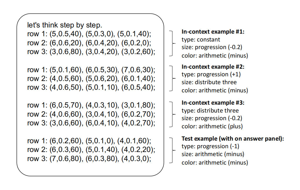 图 A2:在纠缠设置中使用三个上下文示例提示进行 GPT-3 实验。这中心星座中的单个物体被编码为(类型,大小颜色).OOD 测试侧重于属性大小的算术规则.上下文示例显示了算术规则的示例属性颜色.在此提示中,文本示例中的空白面板填充有第一个候选者面板,这不是正确的面板。