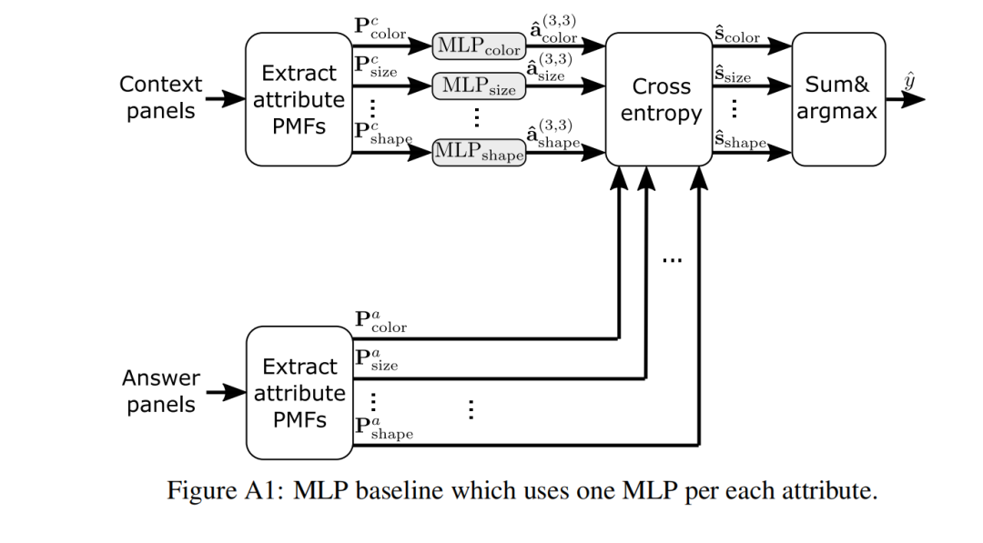 MLP基线的第一步涉及处理派生的属性值。这些值被转换为one‑hot PMF。一旦转换为PMF 格式,这些表示将由每层具有1024个隐藏维度的3层MLP进行处理。该MLP的输出是另一个跨越属性值的PMF。对于每个属性,使用交叉熵将其关联的PMF向量与所有候选面板的PMF向量进行比较。对于每个属性,我们获得与八个候选面板相对应的八个分数。最后,我们计算每个属性的平均值,得出八个总体候选分数。选择得分最高的候选小组。