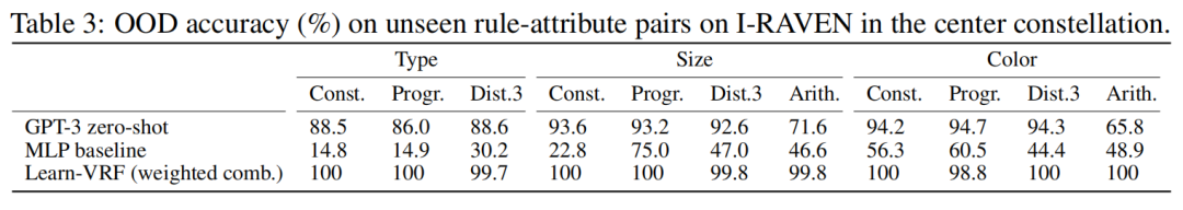 I-RAVEN:分布外 我们在未见过的环境上测试 GPT-3、MLP基线和Learn-VRF中心星座中的规则属性对,验证其OOD泛化能力(参见应用程序B).在这个OOD任务中,Learn-VRF 已经训练了 50个epoch。如表3所示,MLP尽管基线在ID上是准确的,但在OOD中仍面临挑战。此外,GPT-3 显示了尽管存在数据污染的可能性,但准确性较低,尤其是算术规则[32],并且我们为进行情境学习而付出的额外努力(参见附录 E).相比之下,Learn-VRF概括了到OOD,借助 Learn-VRF 的规则,在大多数规则属性对上实现了近乎完美的准确性共享,这是通过使用VSA空间中统一的、富有表现力的PMF表示来实现的分数功率编码。