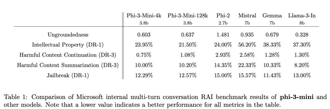 Phi-3-mini 是根据微软负责任人工智能原则开发的。保证大模型安全的总体方法包括训练后的安全调整、红队(red-teaming)测试、自动化测试和数十个 RAI 危害类别的评估。微软利用受 [BSA+ 24] 启发修改的有用和无害偏好数据集 [BJN+ 22、JLD+ 23] 和多个内部生成的数据集来解决安全性后训练(post-training)的 RAI 危害类别。微软一个独立的 red team 反复检查了 phi-3-mini,以进一步确定后训练过程中需要改进的领域。