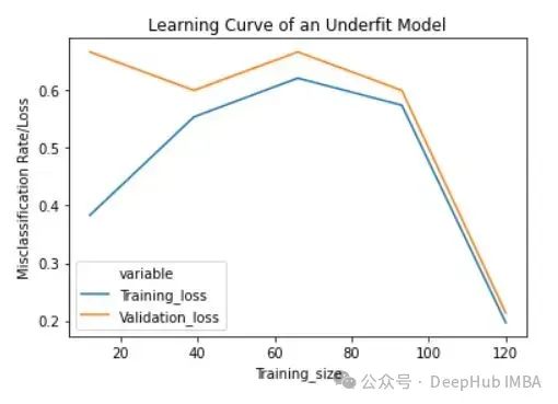 欠拟合模型的学习曲线在开始时具有较低的训练损失,随着训练样例的增加逐渐增加,并在最后突然下降到任意最小点(最小并不意味着零损失)。这种最后的突然下跌可能并不总是会发生。这表明增加更多的训练样例并不能提高模型在未知数据上的性能。
