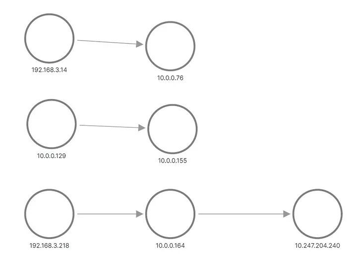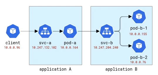顶部和中间行显示某些内容向应用程序 B 的 pod 发送了请求,而底部显示 A 的一个 pod 向服务 B 的虚拟 IP 发送了一个请求。但这看起来根本不像我们预期的那样,对吧?我们只看到三组节点,它们之间没有链接。来自 192.168.3.0/24 子网的 IP 地址是来自集群私有网络(VPC)的节点地址,10.0.0.1/24 是 pod 的地址,但 10.0.0.129 除外,它又是用于节点内通信的节点地址。