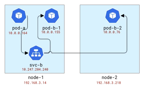 tcp 6 249 CLOSE_WAIT src=10.0.0.76 dst=192.168.3.14 sport=8000 dport=19554 [UNREPLIED] src=192.168.3.14 dst=10.0.0.76 sport=19554 dport=8000 use=1好的,我们看到在第一个节点上,地址已从应用程序 A 的 pod 转换,并获得了具有某个随机端口的节点地址。在第二个节点上,连接信息被反转,因为其自身数据包实际上是回复,但考虑到这一点,我们看到请求来自第一个节点和相同的随机端口。请注意,Node-1 上有两个请求,因为我们发送了 2 个请求,并且它们由不同的 pod 处理:同一节点上的 pod-b-1 和另一个节点上的 pod-b-2。