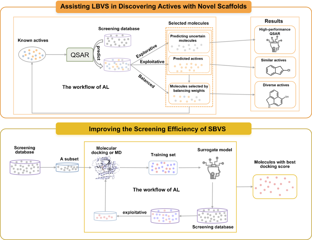 图4 AL缓解两种VS方法的主要缺点:帮助LBVS发现骨架新颖的活性分子和加速SBVS的示意图