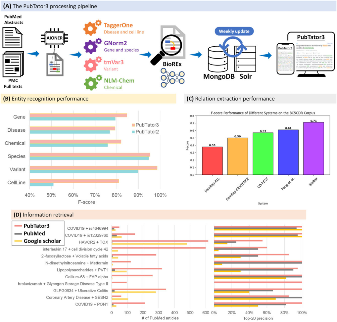 图2A展示了PubTator 3.0的处理流程。AIONER在PubMed摘要和PMC-OA全文文章中识别了六种类型的实体。实体注释通过专门的映射器与数据库标识符相关联,并且BioREx标识实体之间的关系。提取的数据存储在MongoDB中,并使用Solr进行搜索。PubTator 3.0包含超过16亿个实体注释(460万个独特标识符)和3,300万个关系(880万个独特对)。它在实体识别和规范化性能上超越了其前版本PubTator 2,也被称为PubTator Central(图2B)。图2C展示了PubTator 3.0的关系提取能力。与之前最先进系统在BioCreative V化学-疾病关系语料库相比,PubTator 3.0提供了明显更高的准确性。此外,当评估与PubMed和Google Scholar比较的随机实体对查询样本时,PubTator 3.0获取到更多的文章并且在前20个结果中精度更好(图2D)。