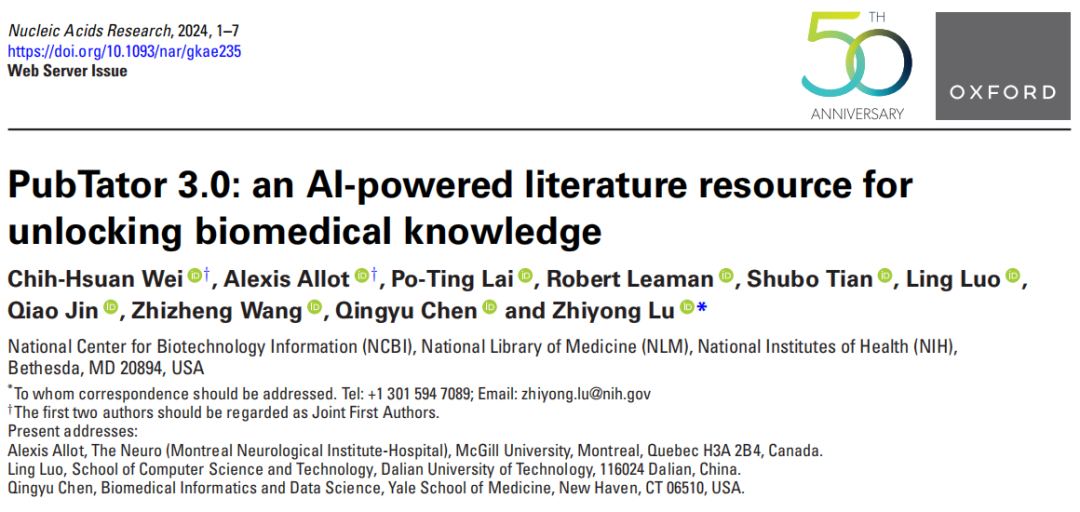 Chih-Hsuan Wei, Alexis Allot, Po-Ting Lai, Robert Leaman, Shubo Tian, Ling Luo, Qiao Jin, Zhizheng Wang, Qingyu Chen, Zhiyong Lu, PubTator 3.0: an AI-powered literature resource for unlocking biomedical knowledge, Nucleic Acids Research, 2024;, gkae235, https://doi.org/10.1093/nar/gkae235