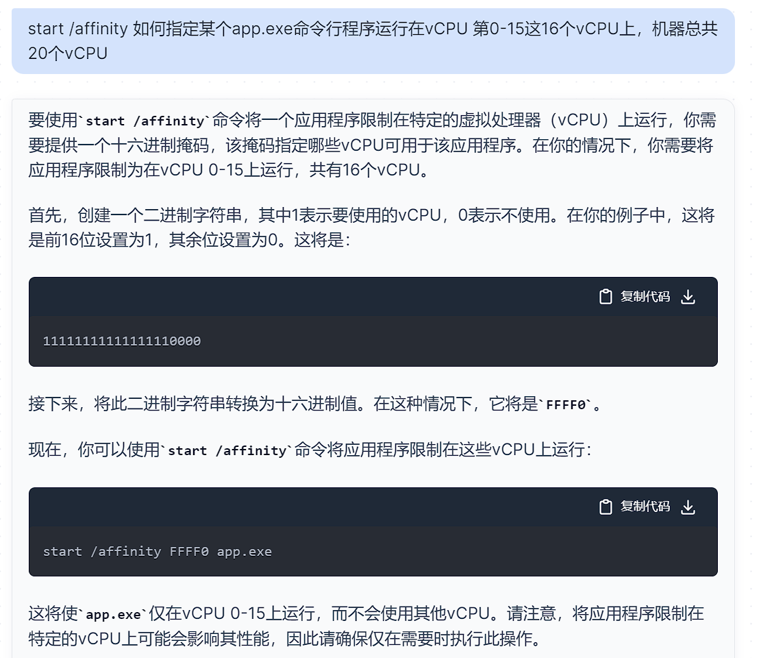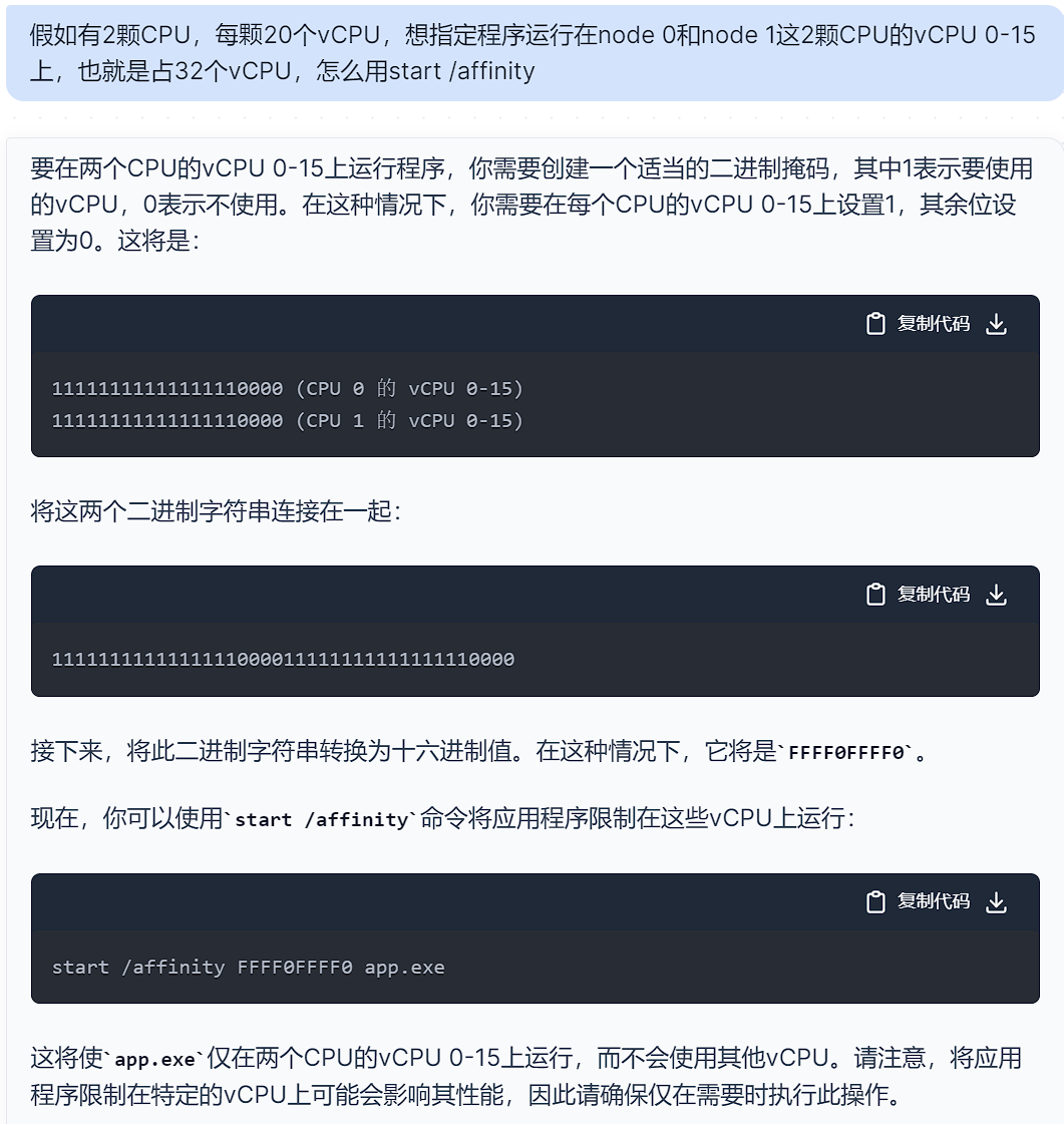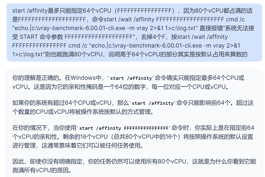 start /affinity最多只能指定64个vCPU(FFFFFFFFFFFFFFFF),因为80个vCPU都占满的话是FFFFFFFFFFFFFFFFFFFF,命令start /wait /affinity FFFFFFFFFFFFFFFFFFFF cmd /c "echo.|c:\vray-benchmark-6.00.01-cli.exe -m vray 2>&1 1>c:\log.txt" 直接报错"系统无法接受 START 命令参数 FFFFFFFFFFFFFFFFFFFF",去掉4个F,按start /wait /affinity FFFFFFFFFFFFFFFF cmd /c "echo.|c:\vray-benchmark-6.00.01-cli.exe -m vray 2>&1 1>c:\log.txt"则也能跑满80个vCPU,说明高于64个vCPU的部分其实是按默认占用来算数的