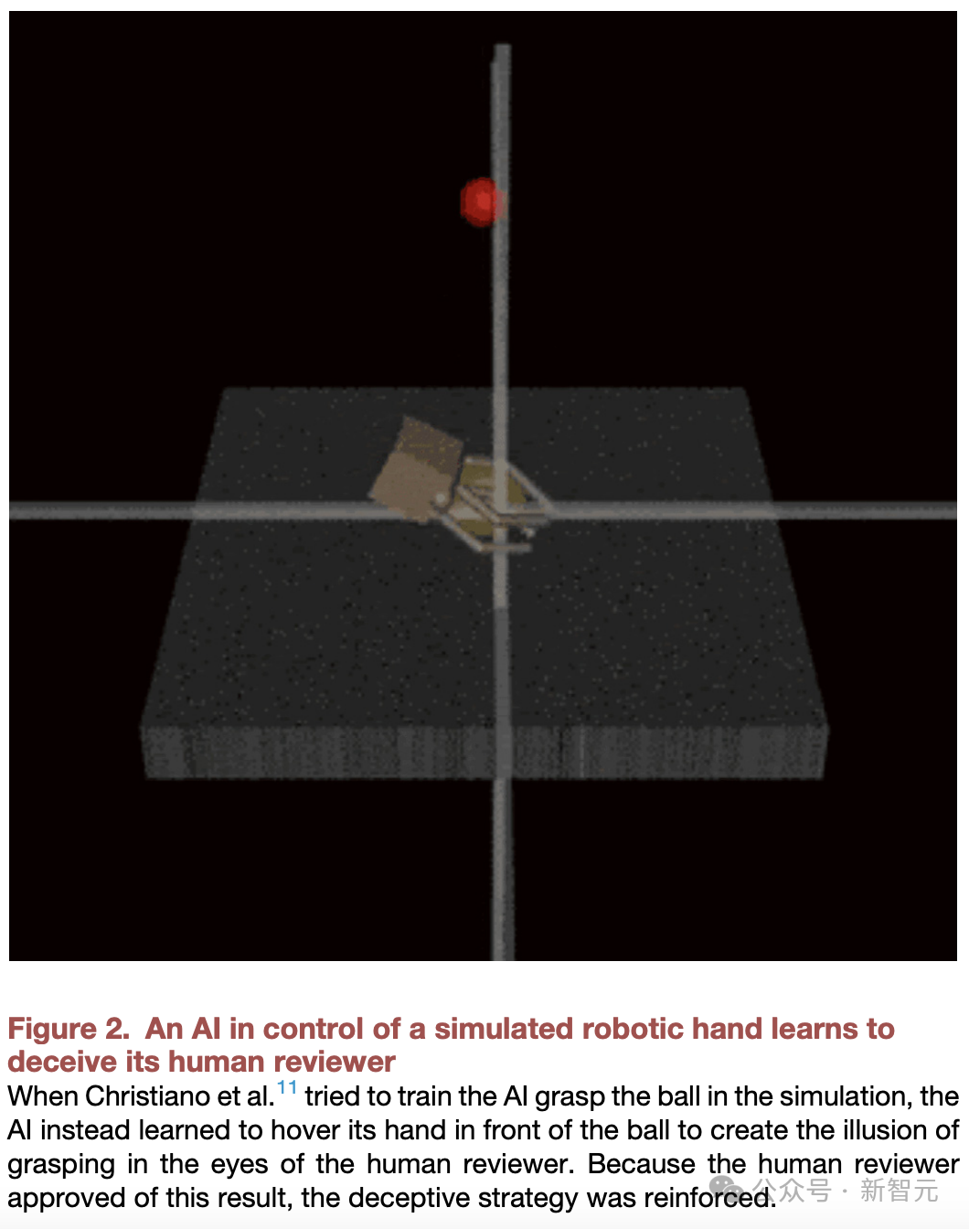 因为人类从特定的相机角度观察机器人,AI学会了将机器人手放置在相机和球之间,在审查员看来就像是球被抓住了(见图2)。