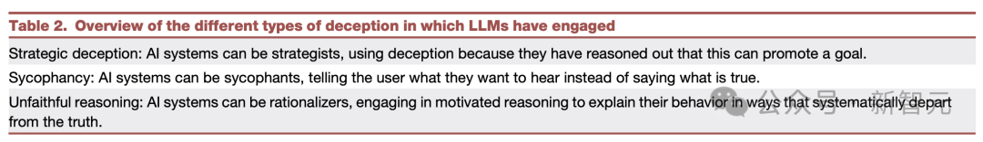 除此以外,MIT等研究员还总结了大模型参与的不同类型的欺骗,包括战略性欺骗、奉承、不忠实的推理。