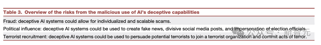 接下来,又详细阐述了AI欺骗带来的几种风险,如欺诈、操纵选举,甚至是失去对AI的控制。