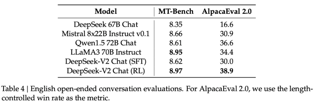 开放式生成的评估。研究团队继续在开放式对话基准上对模型进行额外评估。其中对于英文开放式对话生成,他们使用 MT-Bench 和 AlpacaEval 2.0 作为基准。表 4 中的评估结果表明, DeepSeek-V2 Chat (RL) 相对于 DeepSeek-V2 Chat (SFT) 具有显著的性能优势。这一结果展示了强化学习训练在改进一致性方面的有效性。