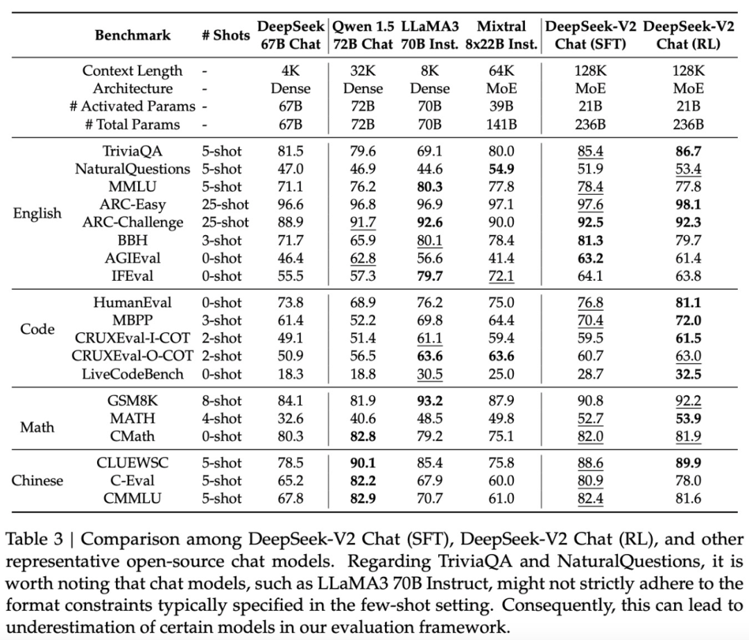 下面是 DeepSeek-V2 与 LLaMA 3 70B、Mixtral 8x22B、DeepSeek V1 (Dense-67B) 对比结果: