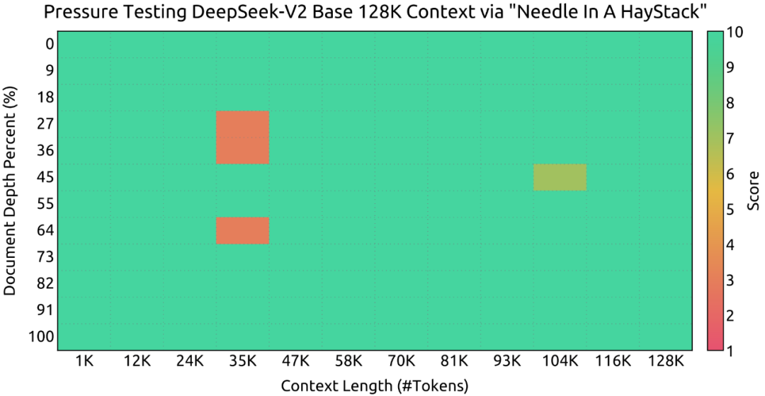 在大海捞针(NEEDLE IN A HAYSTACK)任务中,DeepSeek-V2 在上下文窗口达 128K 时表现良好。
