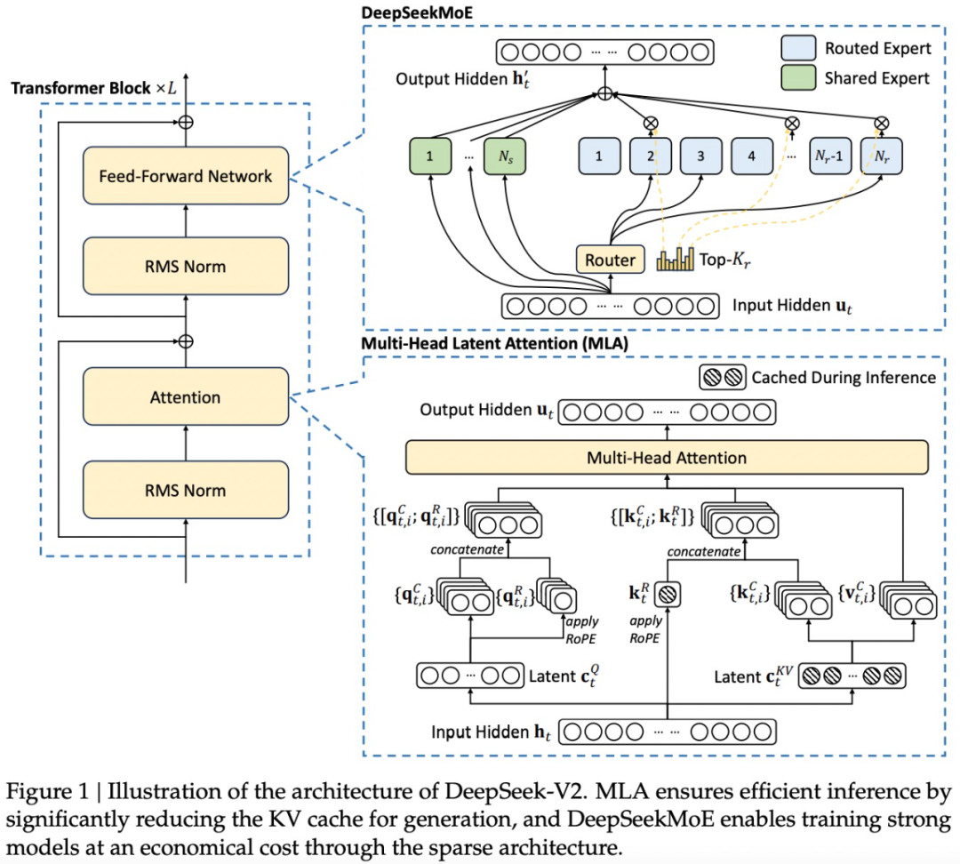 DeepSeek-V2 采用 Transformer 架构,其中每个 Transformer 块由一个注意力模块和一个前馈网络(FFN)组成。然而,对于注意力模块和 FFN,研究团队设计并采用了创新的架构。