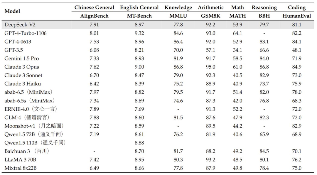 DeepSeek-V2 的模型表现非常亮眼:在 AlignBench 基准上超过 GPT-4,接近 GPT-4- turbo;在 MT-Bench 中与 LLaMA3-70B 相媲美,并优于 Mixtral 8x22B;擅长数学、代码和推理。