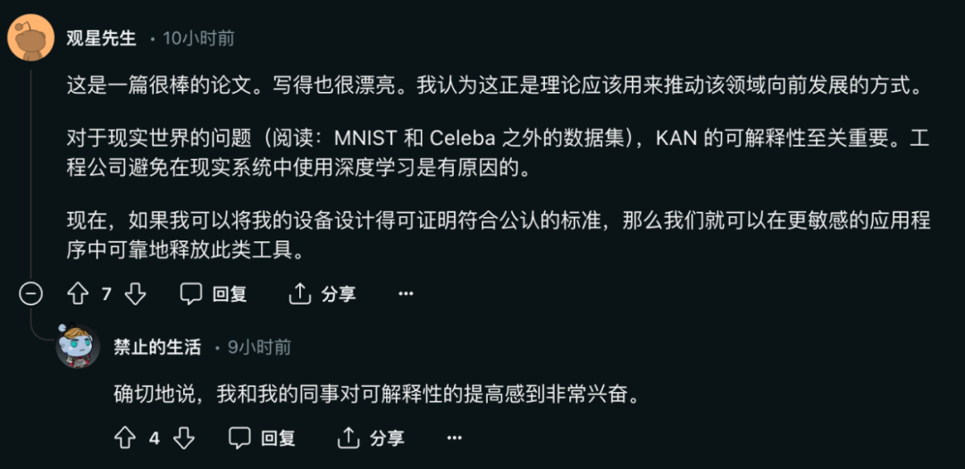我欢迎人们批评 KAN,实践是检验真理的唯一标准。很多事情我们事先并不知道,直到它们经过真正的尝试并被证明是成功还是失败。尽管我愿意看到 KAN 的成功,但我同样对 KAN 的失败感到好奇。 KAN 和 MLP 不能相互替代,它们在某些情况下各有优势,在某些情况下各有局限性。我会对包含两者的理论框架感兴趣,甚至可以提出新的替代方案(物理学家喜欢统一理论,抱歉)。