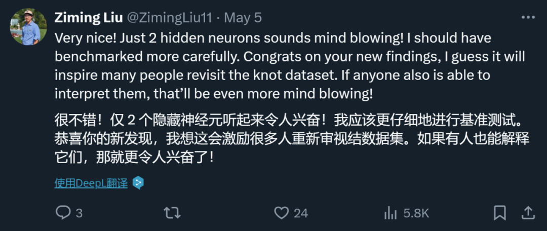 「我认为人们需要停止将 KAN 论文视为深度学习基本单元的巨大转变,而只是将其视为一篇关于深度学习可解释性的好论文。在每条边上学习到的非线性函数的可解释性是这篇论文的主要贡献。」