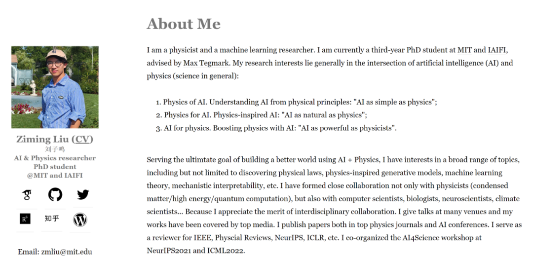 KAN 论文一作刘子鸣。他是一名物理学家和机器学习研究员,目前是麻省理工学院和 IAIFI 的三年级博士生,导师是 Max Tegmark。他的研究兴趣主要集中在人工智能 AI 和物理的交叉领域。