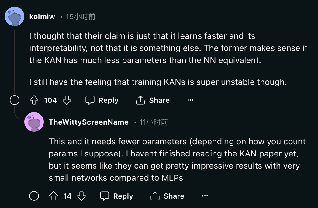 但问题在于:「我认为他们的主张只是它学得更快并且具有可解释性,而不是其他东西。如果 KAN 的参数比等效的 NN 少得多,则前者是有意义的。我仍然感觉训练 KAN 非常不稳定。」