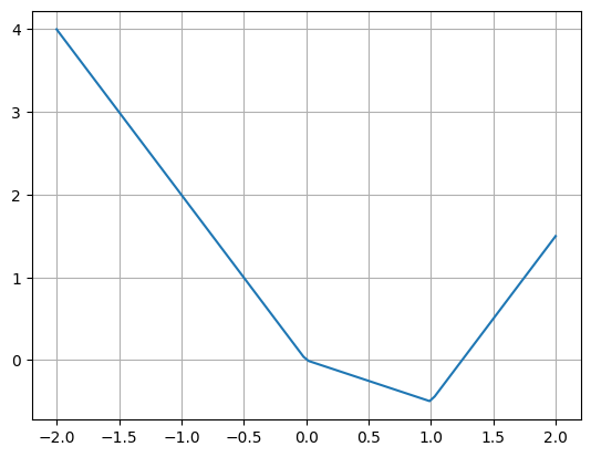 plt.plot(X, -2*X + torch.relu(X)*1.5 + torch.relu(X-1)*2.5)