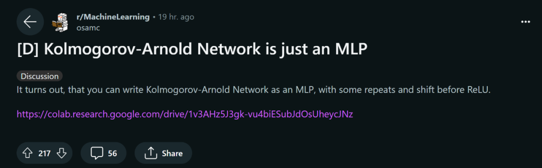 这些惊人的结果让 KAN 迅速走红,吸引了很多人对其展开研究。很快,有人提出了一些质疑。其中,一篇标题为《KAN is just MLP》的 Colab 文档成为了议论的焦点。