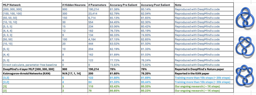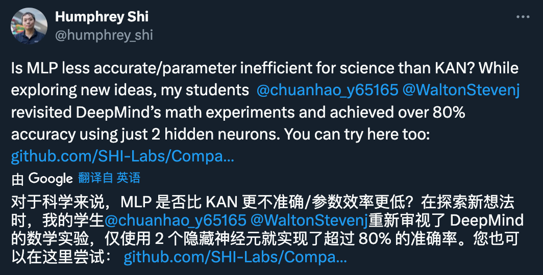 这种说法目前还存在疑问。在论文中,KAN 的作者表示,他们仅用 200 个参数的 KAN,就能复现 DeepMind 用 30 万参数的 MLP 发现数学定理研究。在看到该结果后,佐治亚理工副教授 Humphrey Shi 的两位学生重新审视了 DeepMind 的实验,发现只需 122 个参数,DeepMind 的 MLP 就能媲美 KAN 81.6% 的准确率。而且,他们没有对 DeepMind 代码进行任何重大修改。为了实现这个结果,他们只减小了网络大小,使用随机种子,并增加了训练时间。