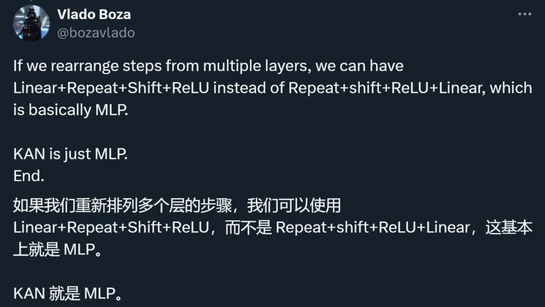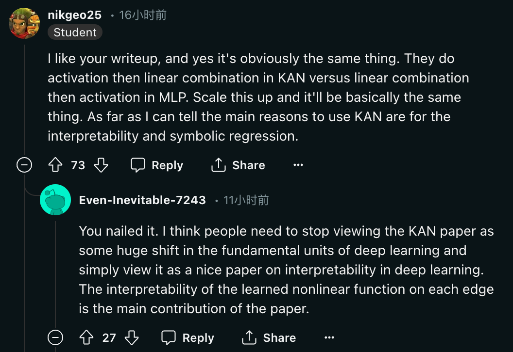 「是的,这显然是一回事。他们在 KAN 中先做激活,然后再做线性组合,而在 MLP 中先做线性组合,然后再做激活。将其放大,基本上就是一回事。据我所知,使用 KAN 的主要原因是可解释性和符号回归。」
