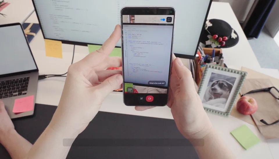 Project Astra 类似一款以取景器作为主界面的应用程序。谷歌在演讲中展示了一个人拿着手机,将摄像头对准办公室的各个地方,并用语言与其交互:“当你看到有东西发出声音时,请告诉我。”在这段视频演示中,Gemini 能识别各种物体甚至代码,并实时与人类进行语音互动。