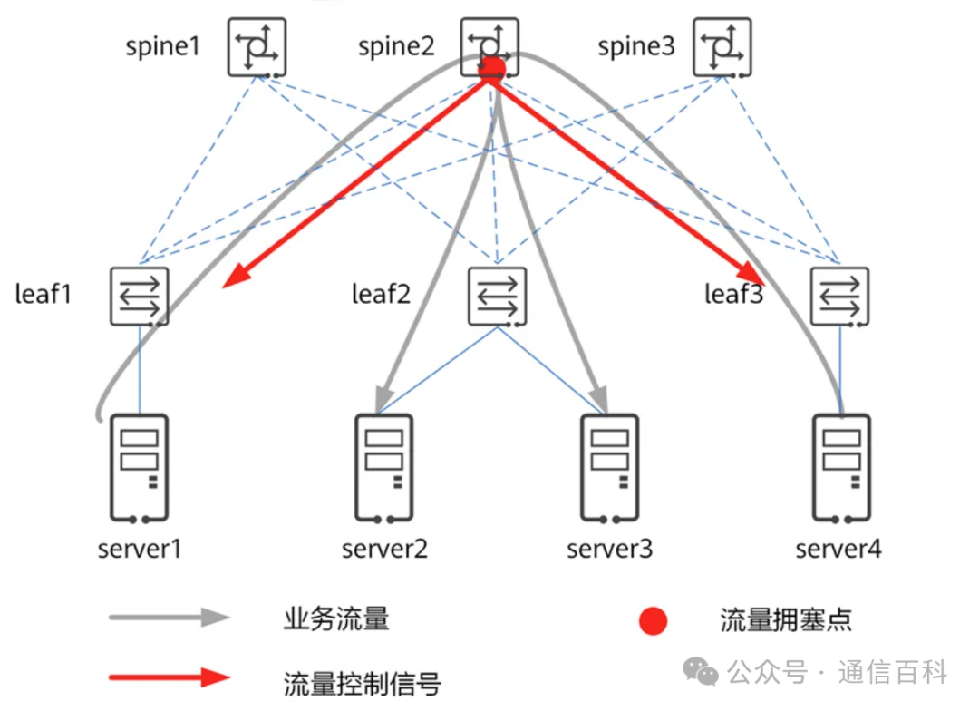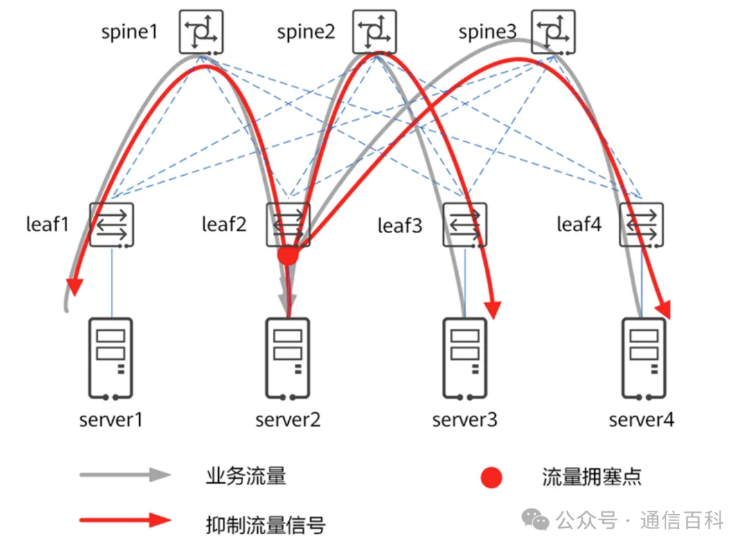 为了保证不出现 buffer 溢出而丢包,交换机 leaf2 必须提前向源端发送信号抑制流量,同时交换机必须保留足够的 buffer 以在源端抑制流量之前接纳报文,这些操作由拥塞控制机制完成。当然,这个信号也可以由服务器 server2 分别发给server1、server3和server4。