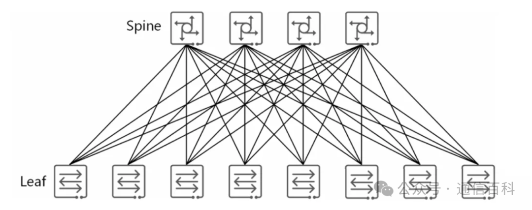 目前数据中心流行的是 CLOS 网络架构:Spine+Leaf 网络架构,如下图所示: