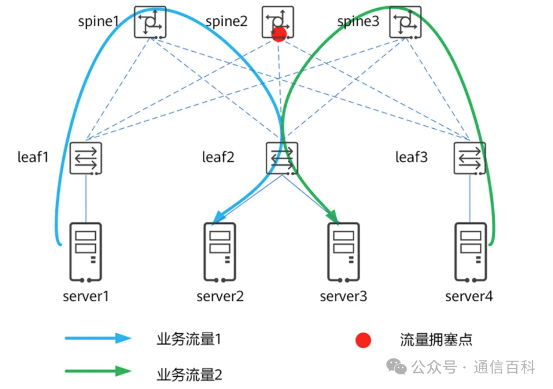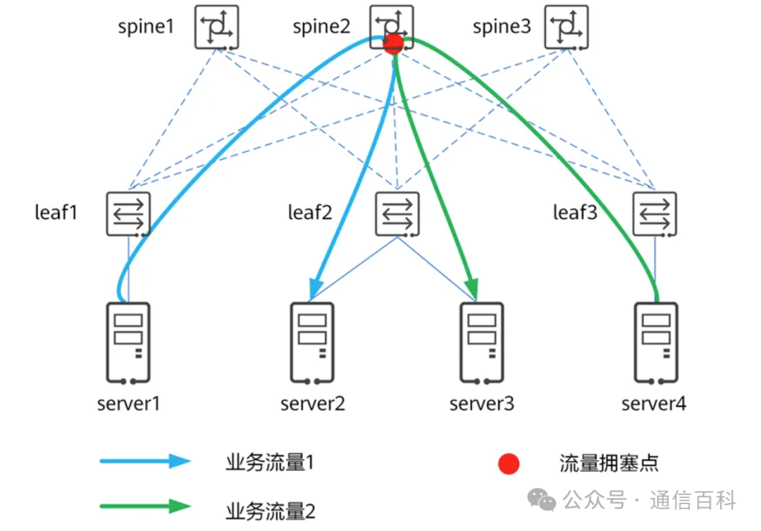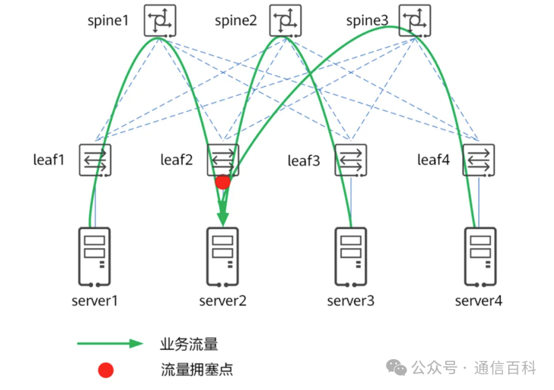 要在 all-to-all 流量模型下实现无损网络,达成无丢包损失、无时延损失、无吞吐损失,需要引入负载分担,目的是控制多个 one 到 one 的流量不要在交换机上形成交叉,如下图所示,流量从 server1 到 spine1 到 server2、从 server4 到spine3 到server3,整网无阻塞。