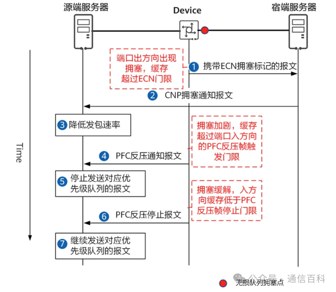在这段时间内,源端服务器仍然会按照原来的发包速率向Device发送流量,从而导致Device设备队列缓存拥塞持续恶化,最终触发 PFC 流控而暂停流量的发送。