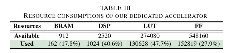 -位乘法,类似于Auto-ViT-Acc [16]以便公平比较。_评估:_ 作者用Verilog实现加速器,通过Vivado Design Suite进行综合,并在Xilinx ZCU102 FPGA上以200-MHz的频率进行评估。表3列出了作者的资源消耗。此外,作者为作者的加速器开发了一个周期精确的模拟器,以获得快速可靠的估算,并通过与RTL实现对比来确保正确性。