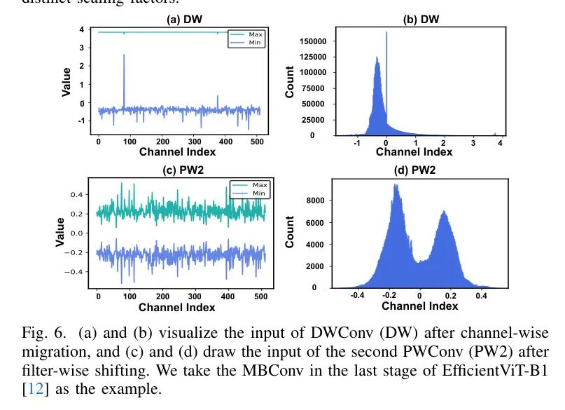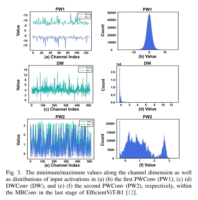 挑战二:PW2输入中的通道间不对称性。如图3(e)所示,与图3(a)中PW1的输入激活值相比,PW2的输入激活值表现出极端的通道间不对称性,导致值范围更广,从而降低了量化分辨率。例如,在EfficientViT-B1最后一个阶段的MBConv中的PW2输入中,第一个通道的区间为(