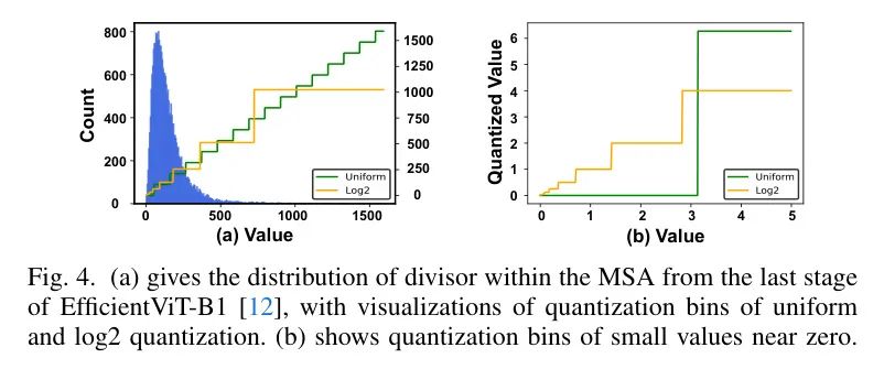 (iv) 因此,作者建议对除数采用以2为底的对数量化,这为较小的值分配了更多的箱,并且与除数的算法性质本质上兼容,从而允许仅用4位有效地量化除数。