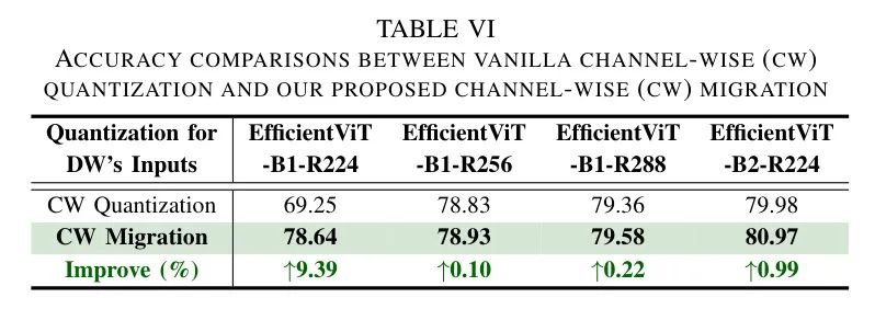 提出的通道迁移的有效性。考虑到DWConvs的独特算法特性,其中每个权重通道作为一个独立的滤波器处理每个输入通道,通道量化是解决DW输入中通道间变化的直接解决方案,如第IV-B节所述。然而,这将大大增加缩放因子的数量,通过LSQ [32]进行量化优化挑战性增加,限制了可实现的准确性。因此,作者建议在层量化之上采用通道迁移。如表6所示,通过这样做,作者可以提供平均