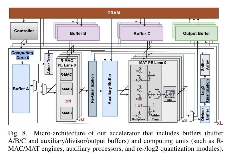 至于内部缓冲区,缓冲区A将数据广播到R-MAC引擎中的所有PE通道,也可以将数据发送到辅助加法树。辅助缓冲区缓存R-MAC引擎的输出,并将数据广播到MAT引擎中的所有PE通道,作为两个引擎之间的桥梁。除数缓冲区存储等式(4)中的除数,然后将其传输到log2量化模块,为随后的位运算移位做准备。