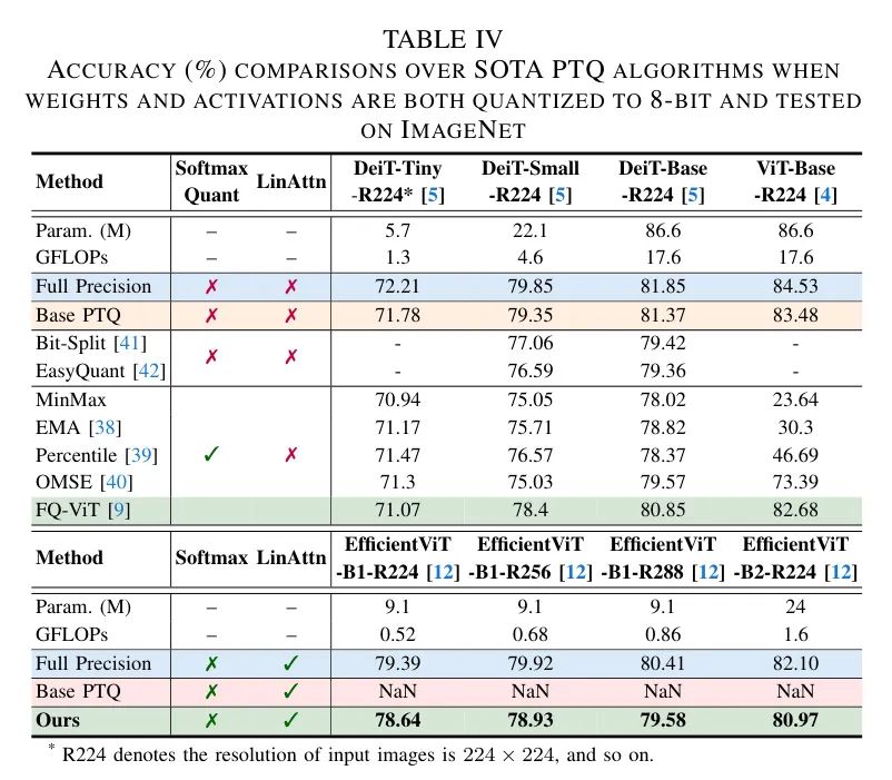 (iii) 然而,由于MBConvs和MSAs中激活分布的不同,如第IV-A节所述,普通的PTQ方法无法量化EfficientViT,甚至产生了非数字(NaN)问题。
