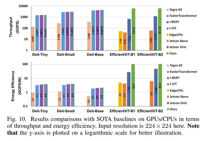 (i)全精度ViTs在广泛使用的边缘GPU(NVIDIA Tegra X2)上执行;8位量化ViTs遵循
