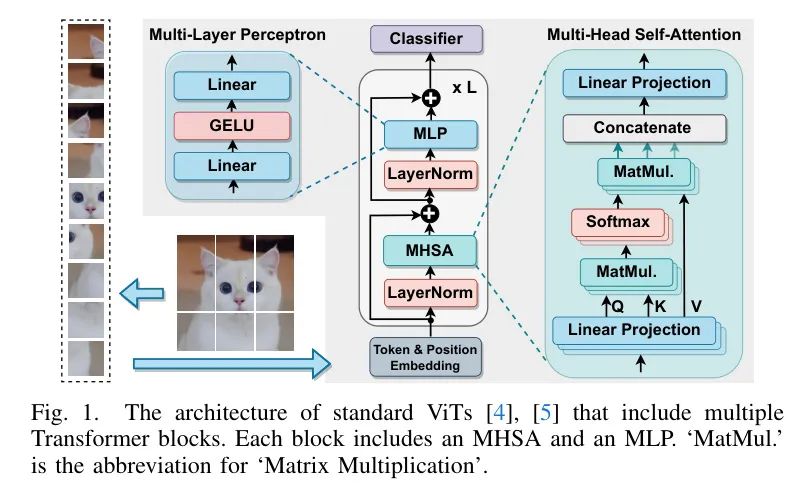 如图1所示,输入图像最初被划分为固定大小的块,并通过 Token 和位置嵌入进一步增强,作为ViTs Transformer 块的输入 Token 。