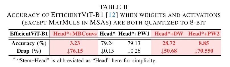 尽管已经广泛认识到激活值对量化的敏感性高于权重,但在EfficientViT的背景下,这种敏感性被加剧了。如表格I所示,仅将EfficientViT-B1 的权重量化为8位(W8)与全精度版本相比,具有可比较的准确度(