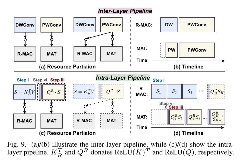 如上所述,作者的专用加速器融合了基于乘法的引擎(R-MAC和MAT引擎,DWConvs限制在前者)和无需乘法的引擎(辅助处理器,旨在加快MSAs中的计算)。这种架构本质上提供了流水线处理的机会,各种操作可以同时在不同的计算单元上执行,从而提高硬件利用率和吞吐量。至于层间流水线,如图9(a)和(b)所示,当